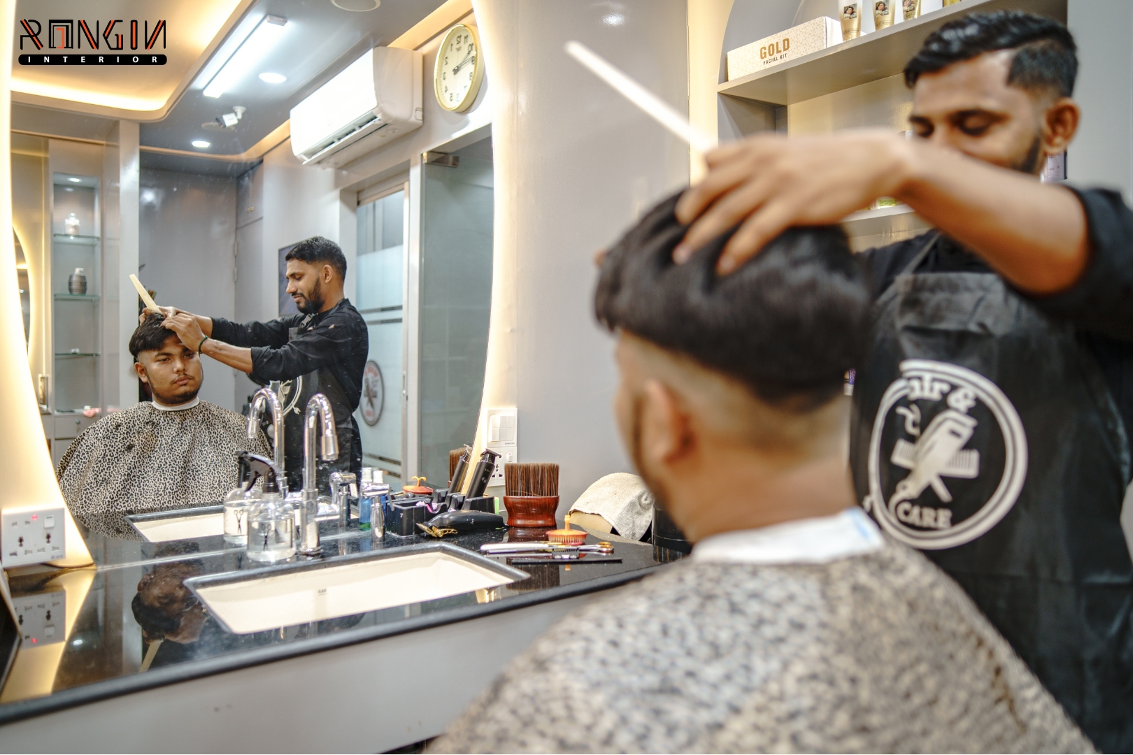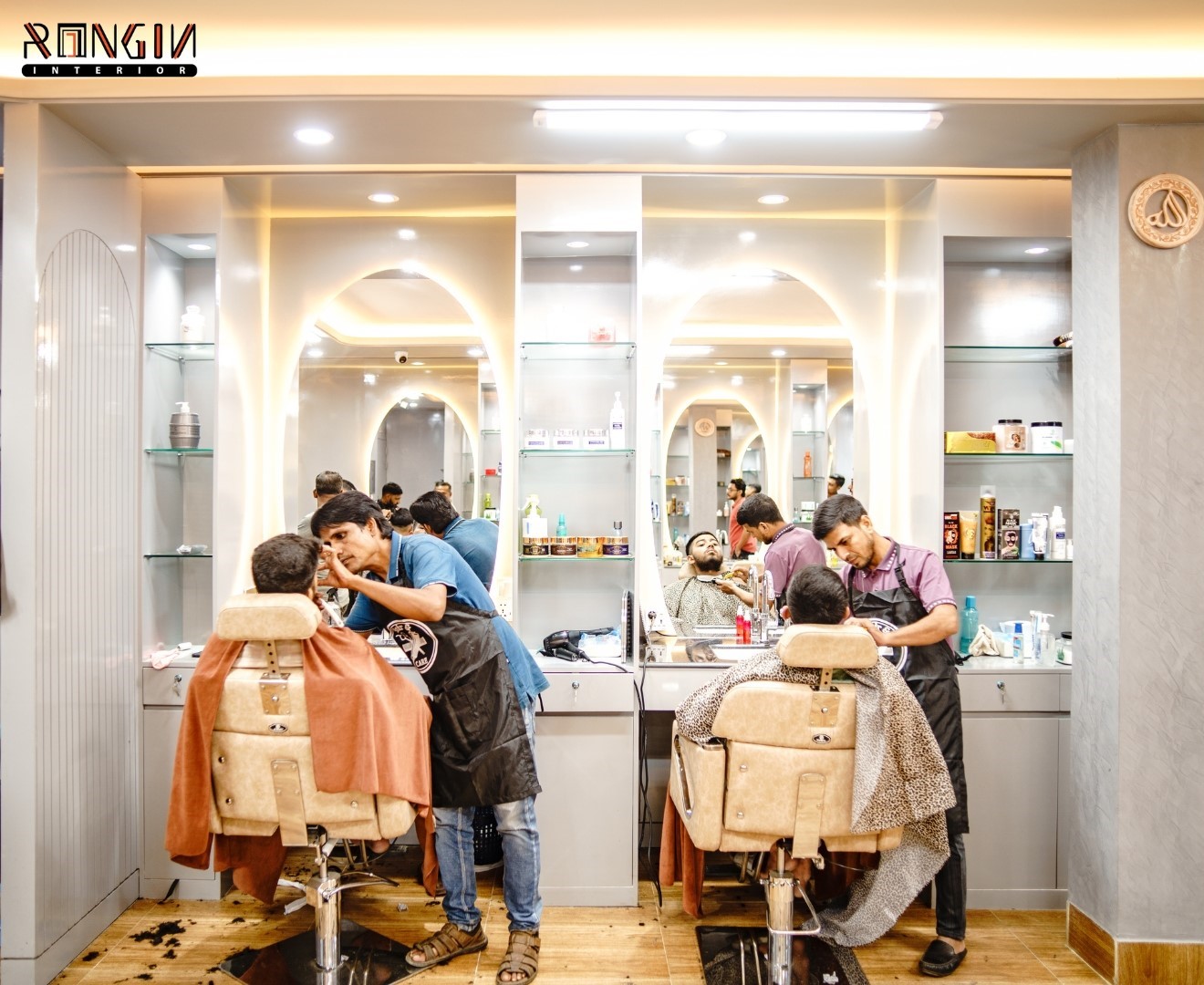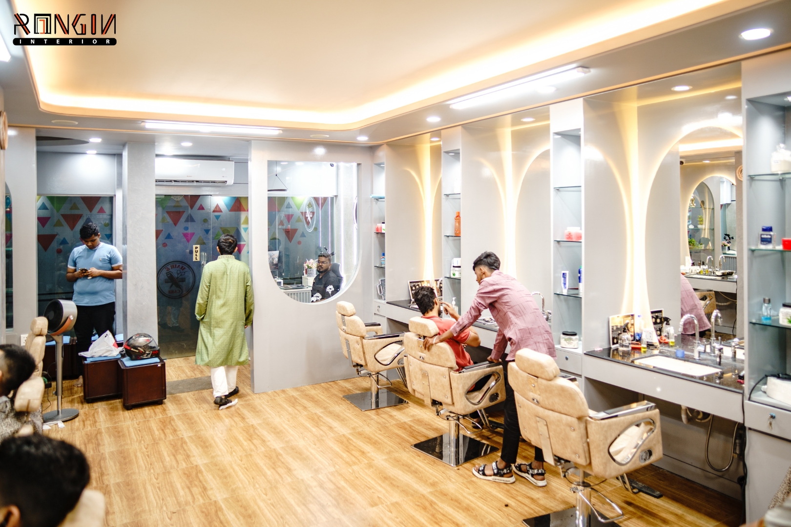 The main challenge was the limited space. We had to fit several cutting stations and a waiting area without making it feel crowded. Managing the hidden electrical wiring for mirrors and plumbing for the wash area was also a tough task to keep everything looking clean.