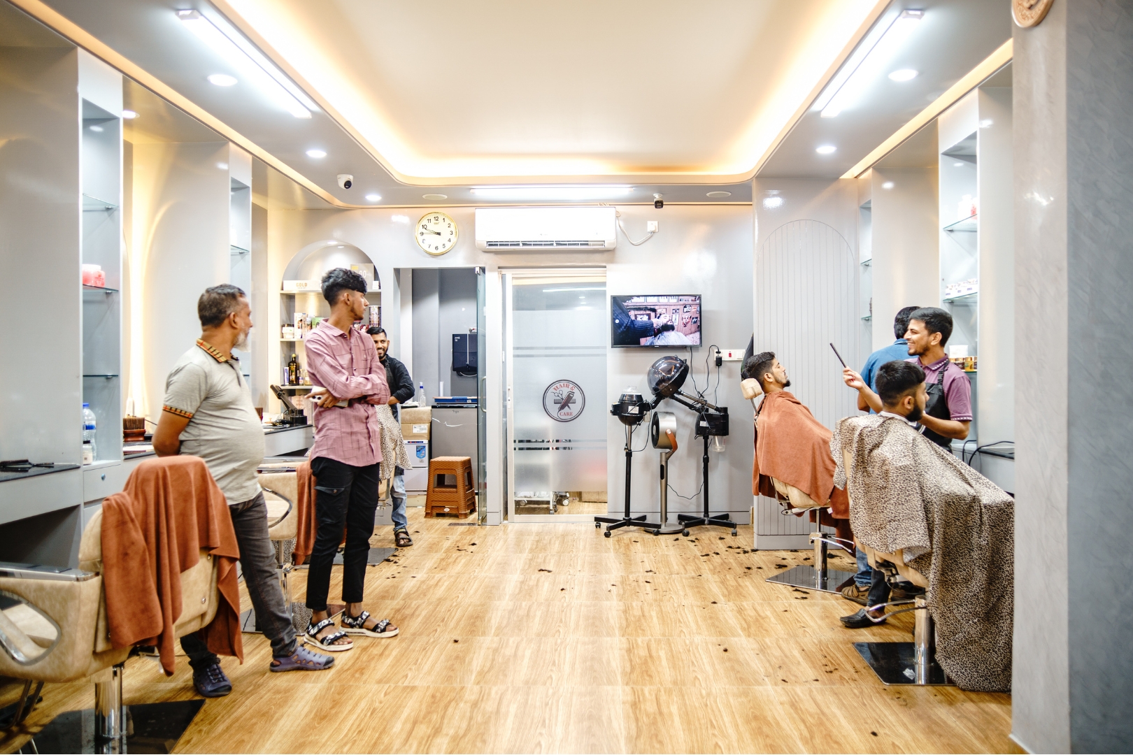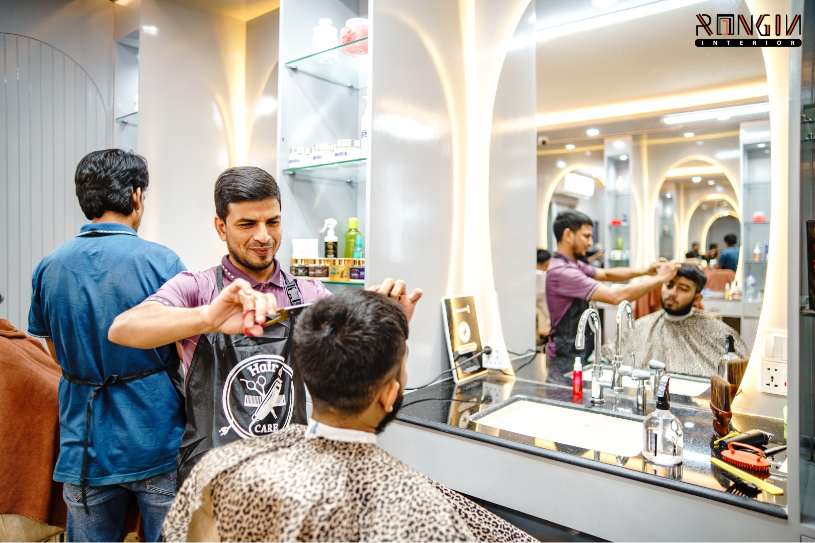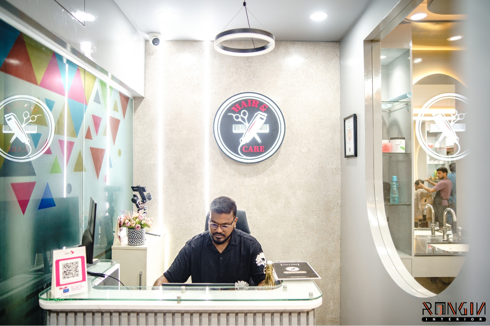 The main challenge was the limited space. We had to fit several cutting stations and a waiting area without making it feel crowded. Managing the hidden electrical wiring for mirrors and plumbing for the wash area was also a tough task to keep everything looking clean.